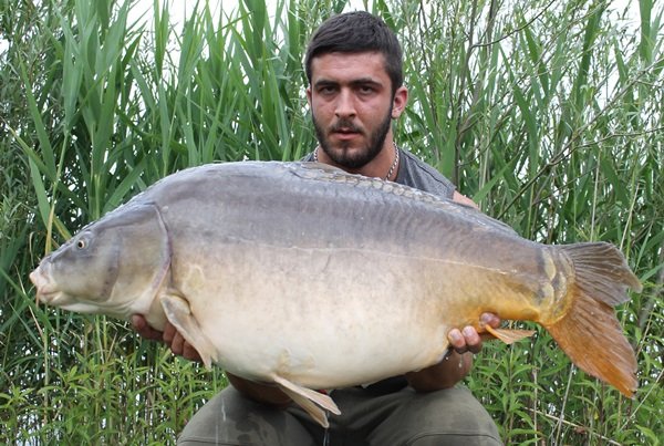 Nur zwei Stunden später hatte ich erneut einen Vollrun wie aus dem Bilderbuch. Nach einiger Zeit im Drill steckte der Karpfen in einem Krautfeld fest. Eigentlich hätte ich sofort ins Boot springen und ihn aus dem Kraut hochpumpen müssen, aber ich versuchte es erst mit Drucknachlassen. Also wartete ich bis sich der Karpfen wieder freischwamm. Was er Gott sei Dank nach einigen Minuten auch tat und ich konnte dann auch noch diese lange Schuppenbombe auf die Matte legen. Ich war voll zufrieden, alles was jetzt noch kommen würde, wären nur noch Bonusfische für mich.