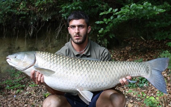 Etwas nach zehn Uhr am Vormittag ging zum ersten Mal die ganz linke Rute ab. Nun ja, im Drill tat der Fisch nicht wirklich etwas, allerdings fühlte sich mein Gegenüber ziemlich schwer an. Kurz vorm Ufer explodierte der Fisch, welcher sich als Amur herausstellte. Immer wieder schoss er wie ein Torpedo weg, aber auch dieser Kampf endete zu meinen Gunsten. Selbst im Kescher ging der Fisch noch extrem ab. Ich wollte ihn trotzdem unbedingt wiegen, da dies mein erster Graskarpfen seit zwei Jahren war. Die Waage zeigte schließlich verdammte 20 Kilo an. Ich war einfach nur baff, ich konnte es kaum fassen. Mit diesem Gewicht ist das nun mein neuer Amur Personal Best.